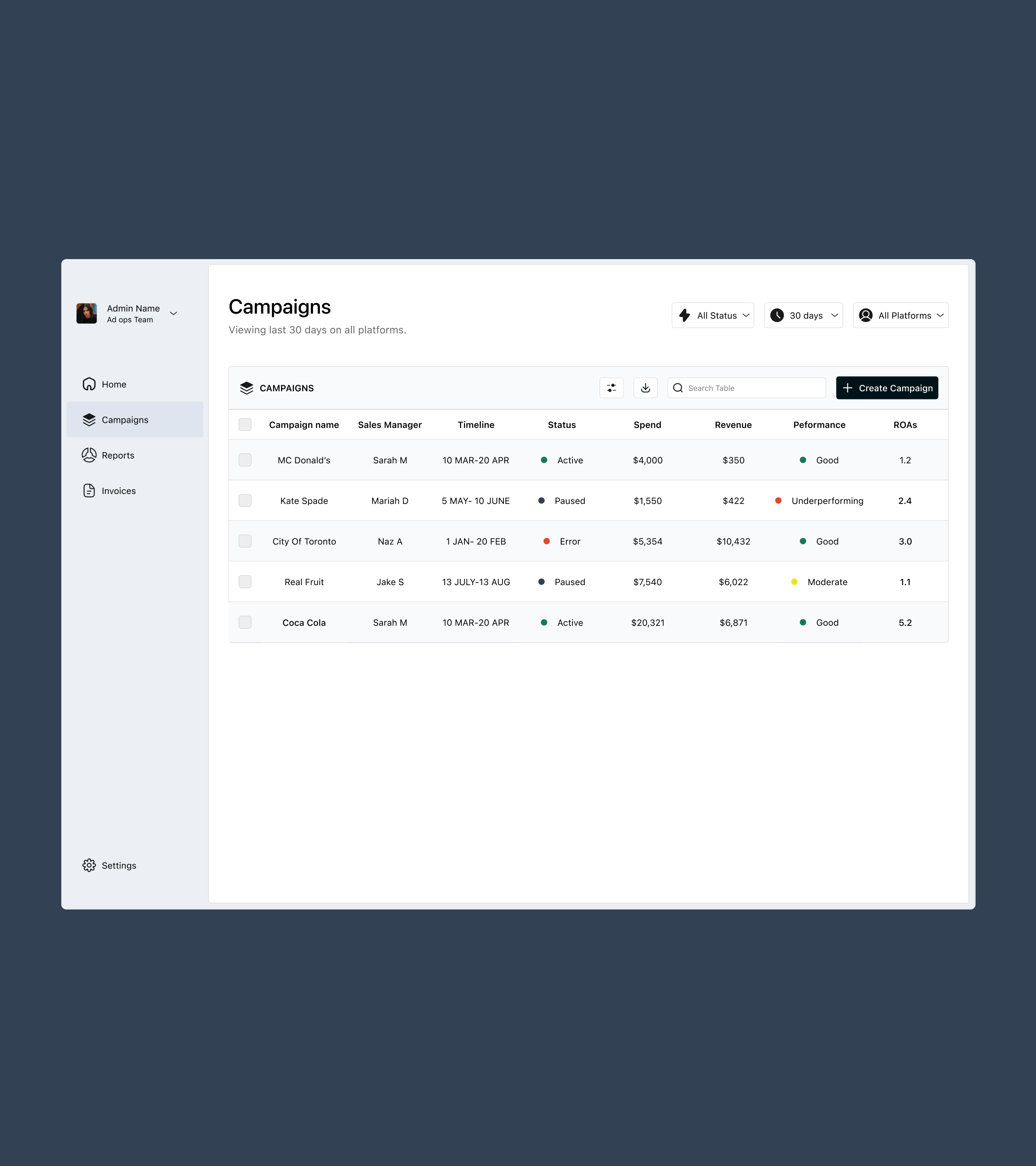 This project was developed as a fictional product based on industry-standard marketing operations patterns, allowing full creative control over interaction design, layout systems, and data presentation while remaining grounded in realistic business use cases.